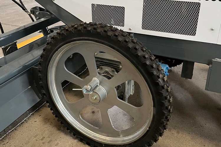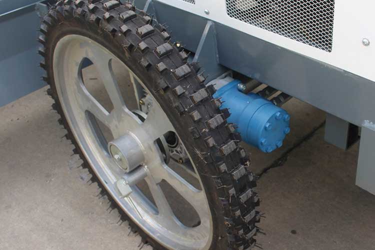 4、獨立四輪移動,方便靈活。通過液壓驅(qū)動車輪行走系統(tǒng),使得輪子可以獨立運動,與整平頭互不影響,使用電控操作輪子的前進、后退、轉(zhuǎn)向及行進速度,移動非常方便。