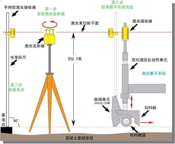 激光整平儀發(fā)射激光信號→激光接收器接收到激光信號→激光信號數(shù)據(jù)傳達(dá)到電腦數(shù)據(jù)處理系統(tǒng)→電腦數(shù)據(jù)處理系統(tǒng)發(fā)送信號到激光整平機(jī)上的雙向液壓缸→雙向液壓缸執(zhí)行命令(刮板、布料螺旋及振搗器沿空間中的激光平面平行運動)→完成激光整平。